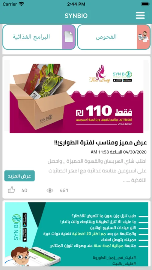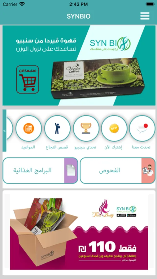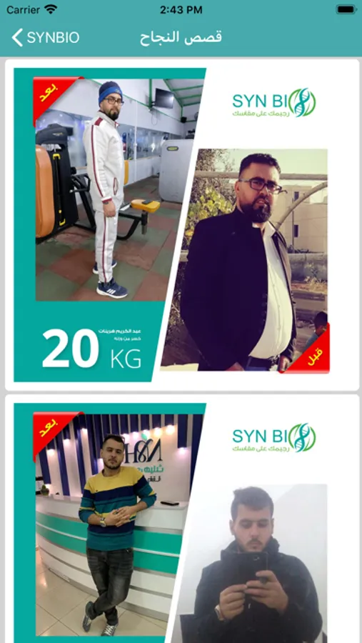 الان باستخدام تطبيق SYNBIO نضع تجربة زيارة احد مراكزنا بين يديك، فور إشتراكك سوف يقوم احد أخصائئينا بالاتصال بك ودراسة حالتك واحتياجات والعوامل الكامنة خلف أختلال الوزن. بعد ذلك سيقوم الاخصائي باعداد خطة عمل وبرنامج غذائي من أجلك.
