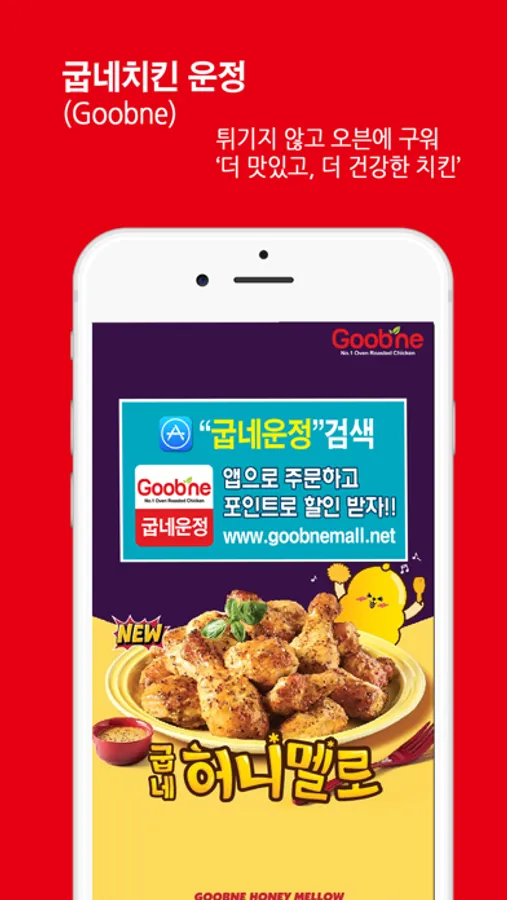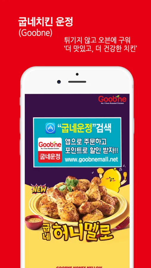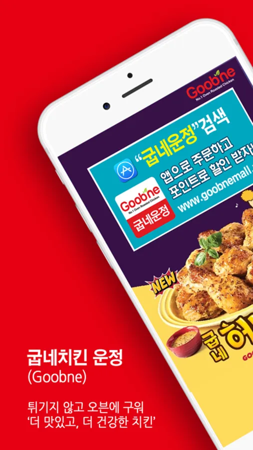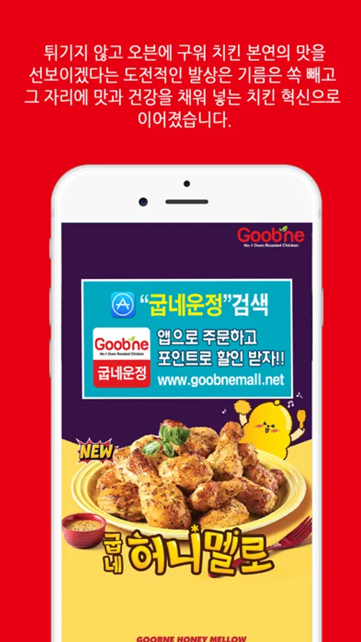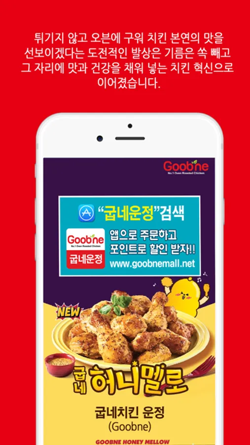 굽네치킨은 업계 트렌드를 선도하는 HIT 제품 출시와 체계적인 마케팅으로 고객 여러분들의 깊은 신뢰와 많은 사랑을 받고 있습니다. 오븐구이만이 구현할 수 있는 '굽네 오리지널', '굽네 볼케이노', '굽네 갈비천왕' 등 차별화 된 메뉴를 지속적으로 출시할 뿐만 아니라, 고객과 소통하기 위해 디지털 매체를 활용한 다양한 마케팅을 펼치며 트렌드의 중심에 서 있습니다.