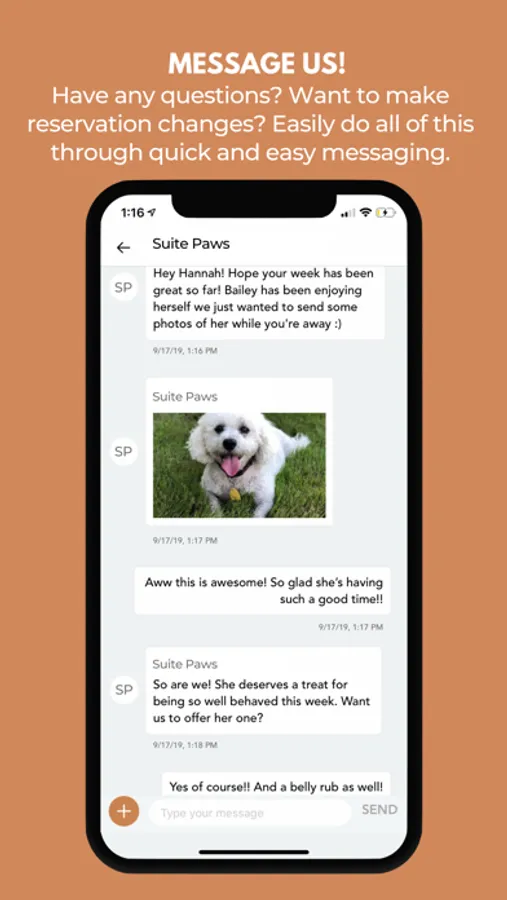Your experience with Suite Paws will never be the same. Instantly request services no matter the time of day. Let Suite Paws know with your expected arrival for quicker check-ins. Always stay connected with your pet with photo updates and one-on-one messaging.