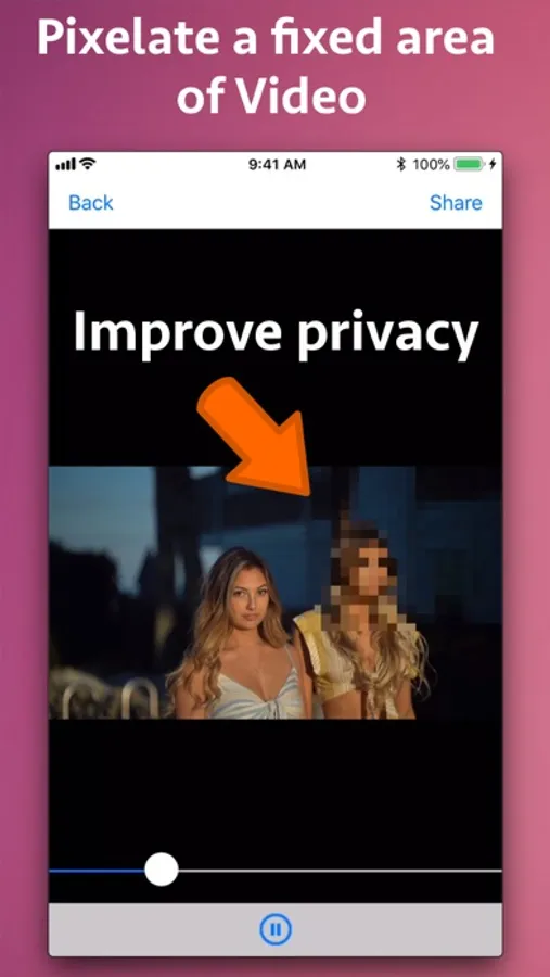 ** Protect privacy and hide certain area of the video by Pixelating : The application comes with 5 different pixelating profiles. All these profiles provide different patterns and visibility levels for pixelating a certain area in the video. In order to pixelate a video, just select a desired area and apply a desired pixelation.