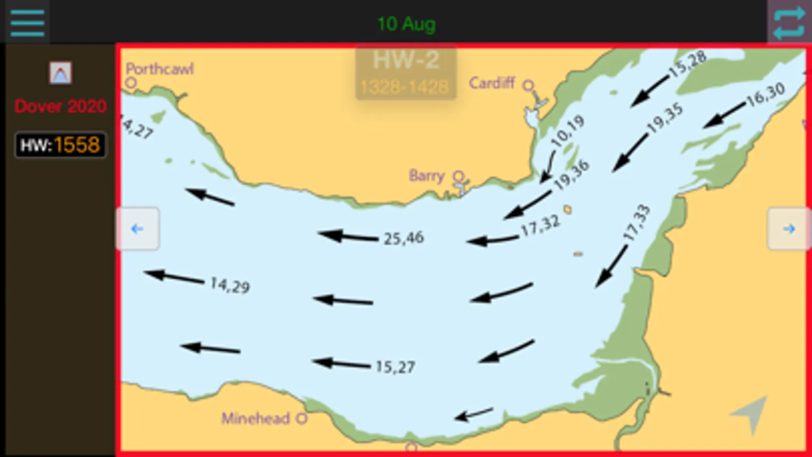 The app automatically selects the nearest Dover HW time of the day, but if you want to see data for the next or previous HW of the day, swipe forward or back to advance the tidal hour.