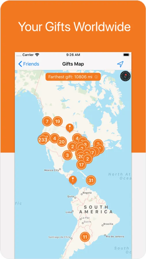 • View your gifts on the World's Map* and find out which gift is the farthest one from your current location