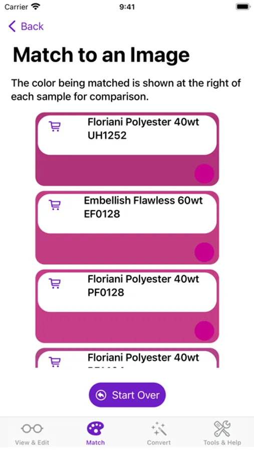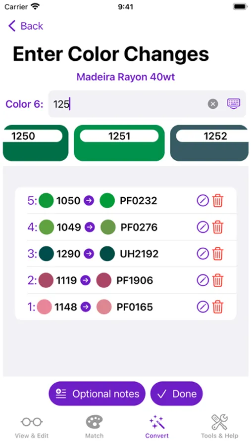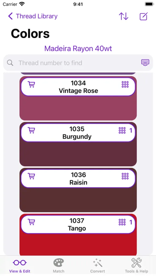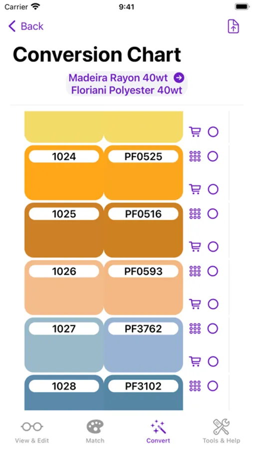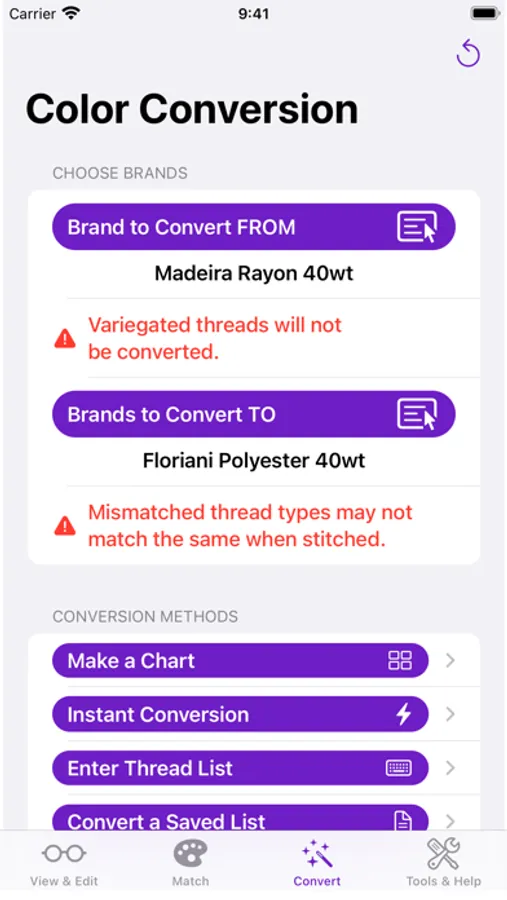 * Instantly create a chart to convert any brand and type of thread to a matching color in any other brand and type