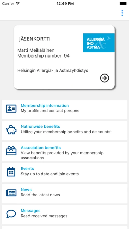 Allergia-, iho- ja astmaliito ry:n jäsenkortti – nyt mobiilisovelluksena puhelimessasi. Allergia- iho- ja astmaliiton jäsenyhdistyksen jäsenenä pääset mukaan allergioita, astmaa ja ihosairauksia sairastavien joukkoon. Saat tietoa, tukea ja vaikutusmahdollisuuksia tärkeisiin meitä koskeviin asioihin! http://www.allergia.fi/yhdessa