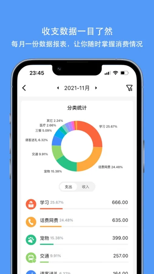 【统计分析】 按年、月、自定义时间的分析统计,单个分类详细统计,饼图、条形图、折线图多种展示形式,多维度分析消费情况,清晰定位消费问题;