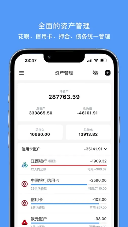 【资产管理】 统一管理包括现金、银行卡、信用卡、储值卡等多种类型账户,记账实时更新,支持多币种资产记录。