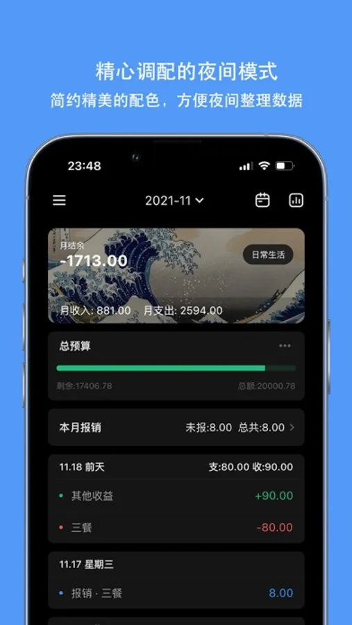 【预算管理】 可设置年度、月度的总预算和分类预算,日均预算动态更新,消费规划更细致。