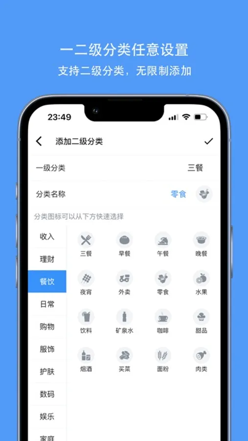【二级分类】 建立一二级分类,细化记录,无任何限制。