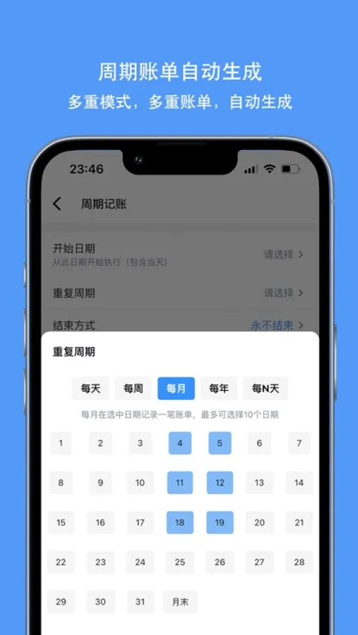 【周期记账】 设置丰富灵活的自动记账任务,到期自动生成账单。