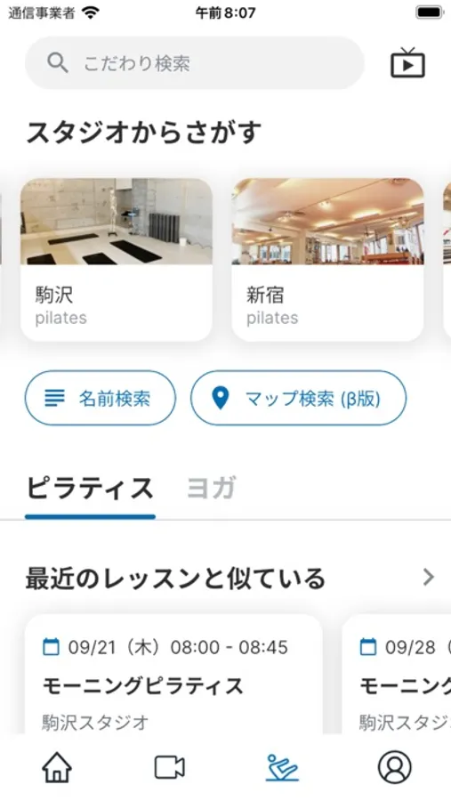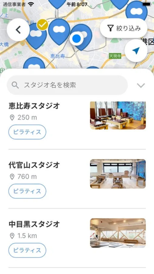 よく行くスタジオの一覧表示ができるようになりレッスンが探しやすくなりました。さらにマップ検索では現在地から近いスタジオをすぐに見つけることができます。
