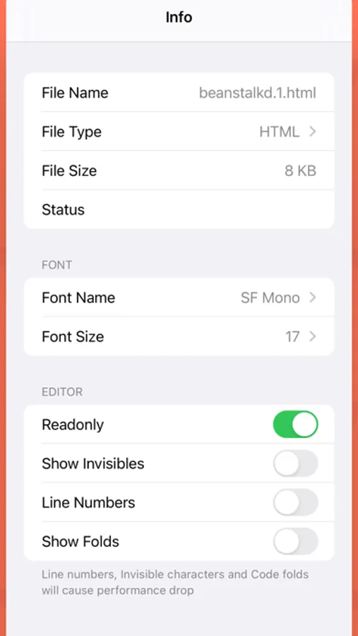 • Text Editor: Toggle line numbers, show the hidden characters liks tabs and line breaks, and configurable font.
