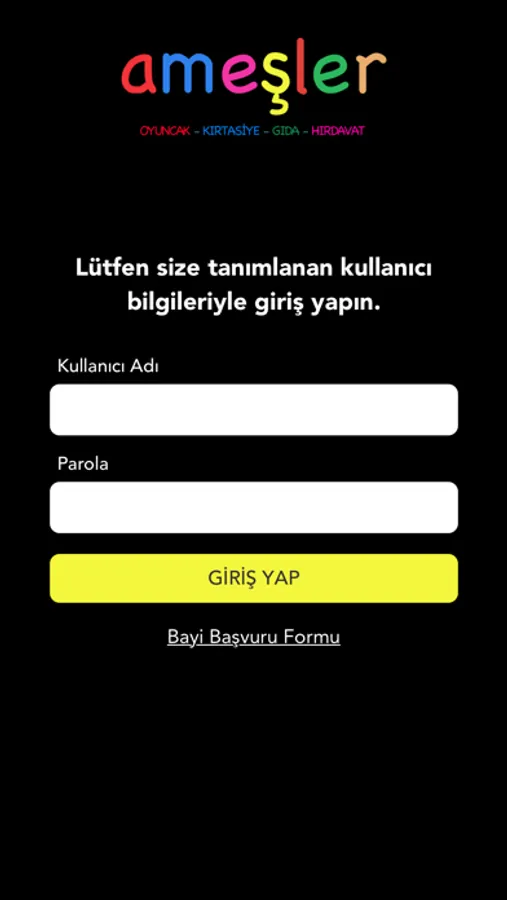 Ameşler Group Mobil Uygulamasını kullanabilmek için kullanıcı adı ve parolanız olmalıdır. Parolanız yoksa 'Bayi Başvuru Formu' doldurarak kullanıcı bilgisi talep edebilirsiniz.