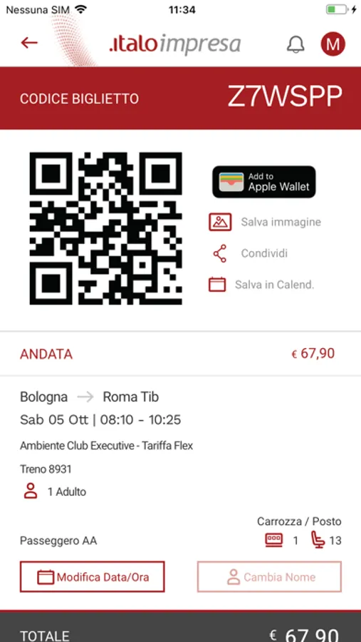 Aggiungi i tuoi viaggi ad Apple Wallet e al Calendario.