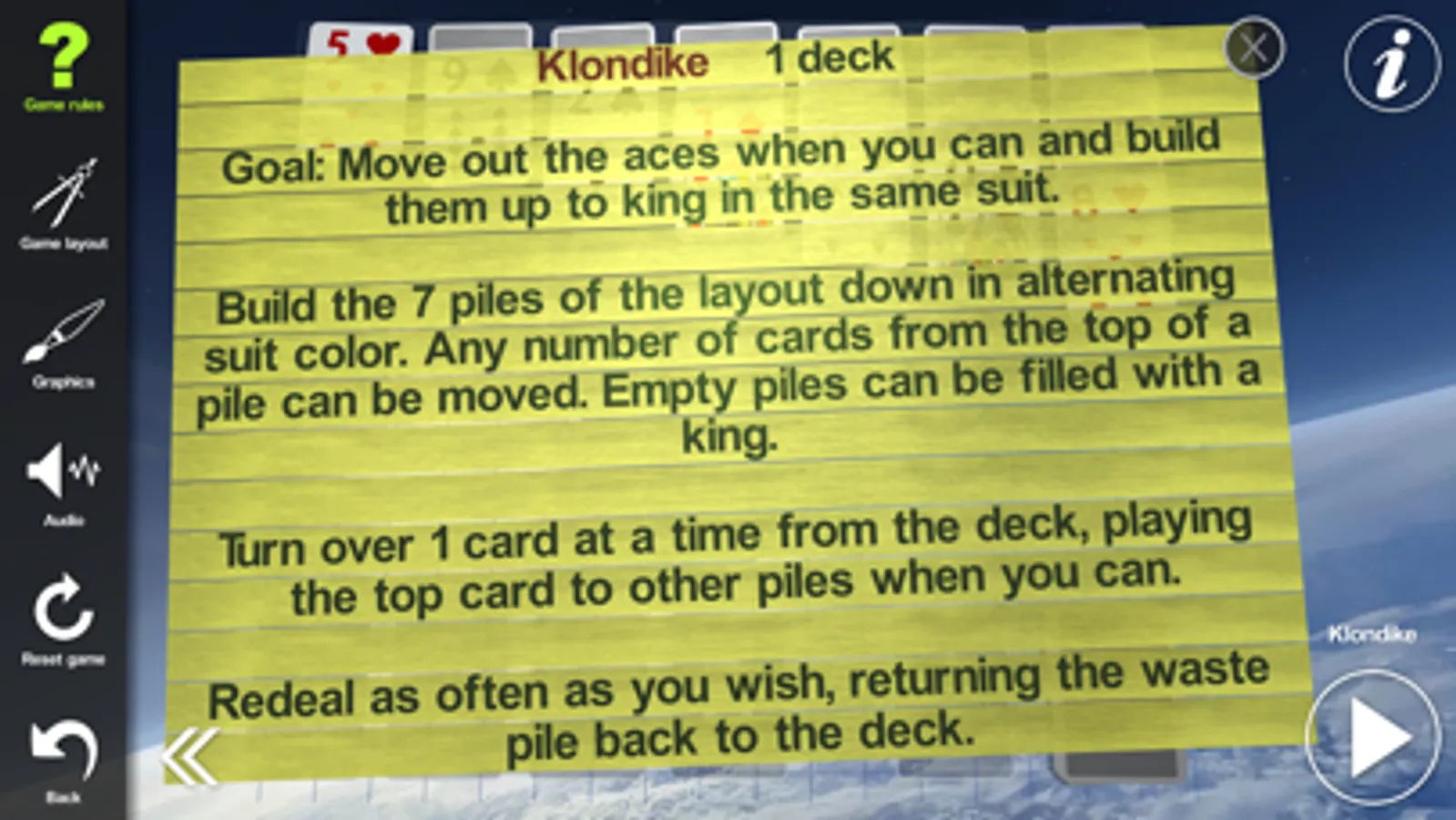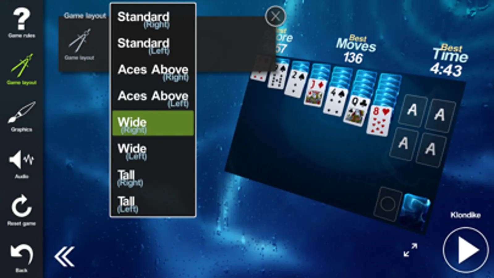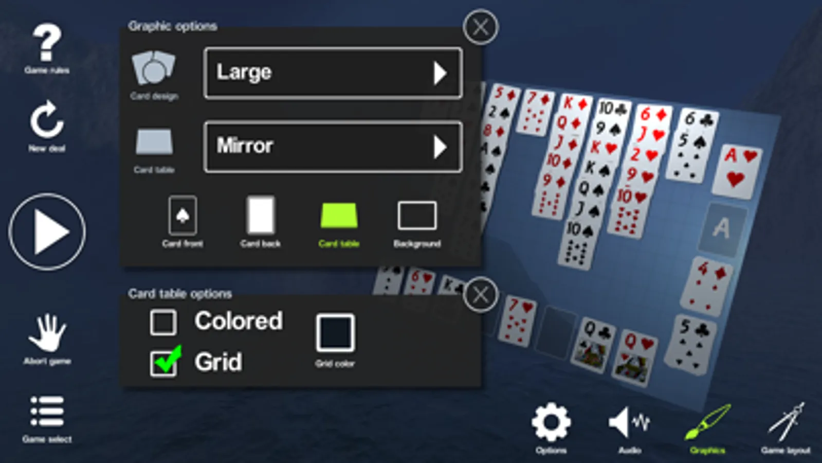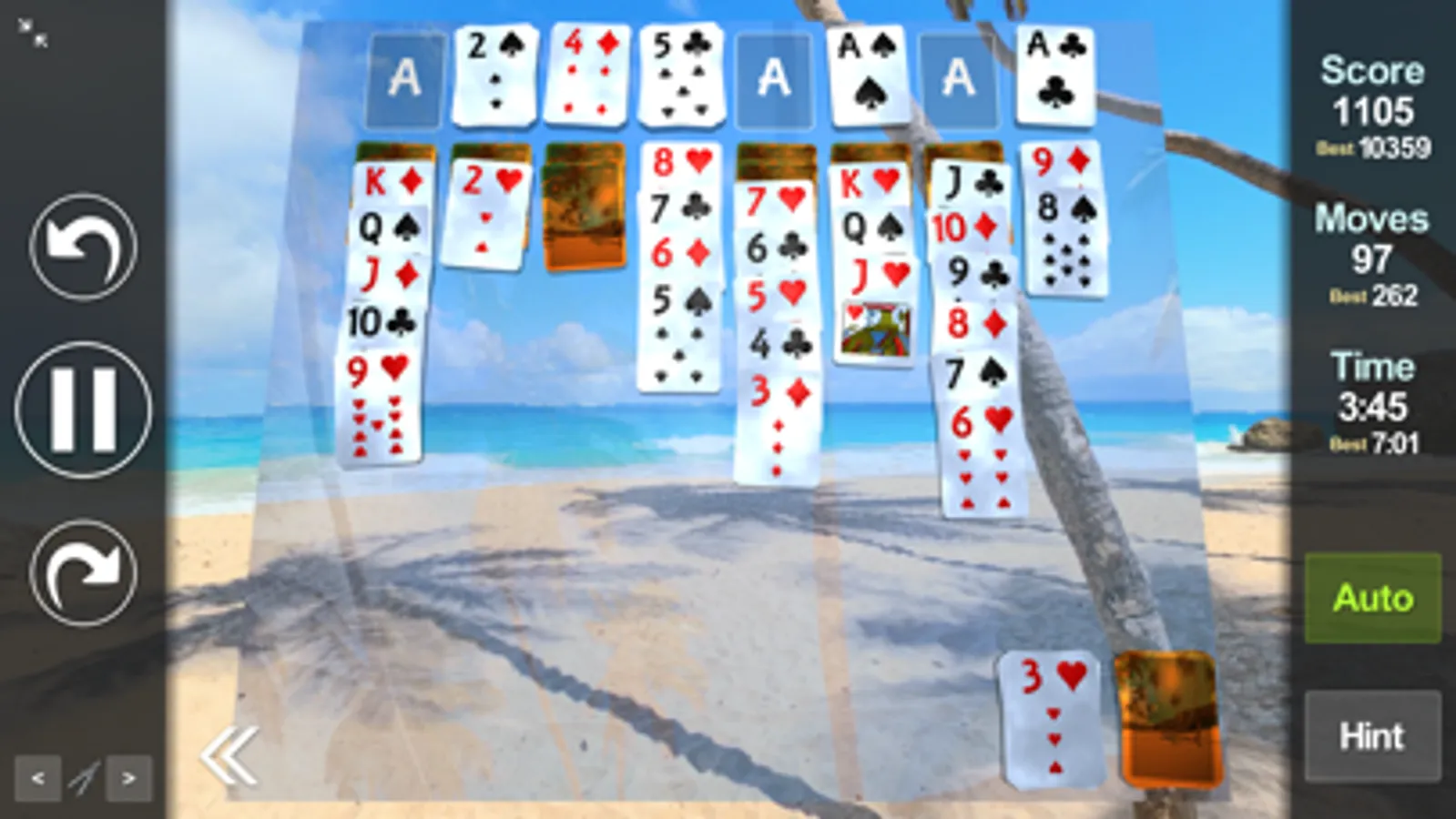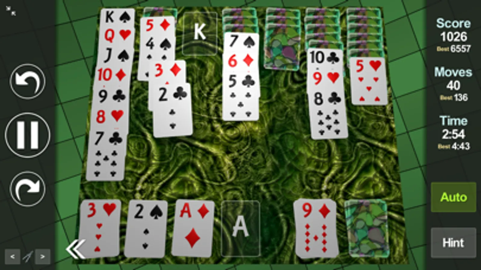 Personalize every game with a choice of card layouts, and rate each game with up to 5 stars. Drag cards, throw cards, or move them automatically with a single touch. A simple user interface offers a high degree of customization, and a wide variety of graphic options. Features include options for card messiness, intelligent auto-play to foundations, auto-flip, hints, unlimited undo and redo, statistics, and the skill-testing pro mode.