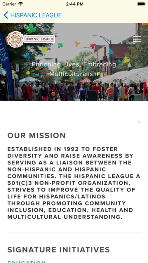 The Hispanic League was established in 1992 to foster diversity and raise awareness by serving as a liaison between the non-Hispanic and Hispanic communities. The Hispanic League strives to improve the quality of life for Hispanics/Latinos through promoting community inclusion, education, health and multicultural understanding.