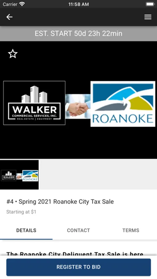 This dynamic app allows you to (1) stay informed about our upcoming auctions; (2) view properties that interest you; (3) get notifications when you've been outbid; (4) bid no matter where you are located (or set and forget your maximum bid to let our platform automatically bid the lowest possible winning bid for you). This is the go-to-source for up-to-the-minute information on all of our auctions.