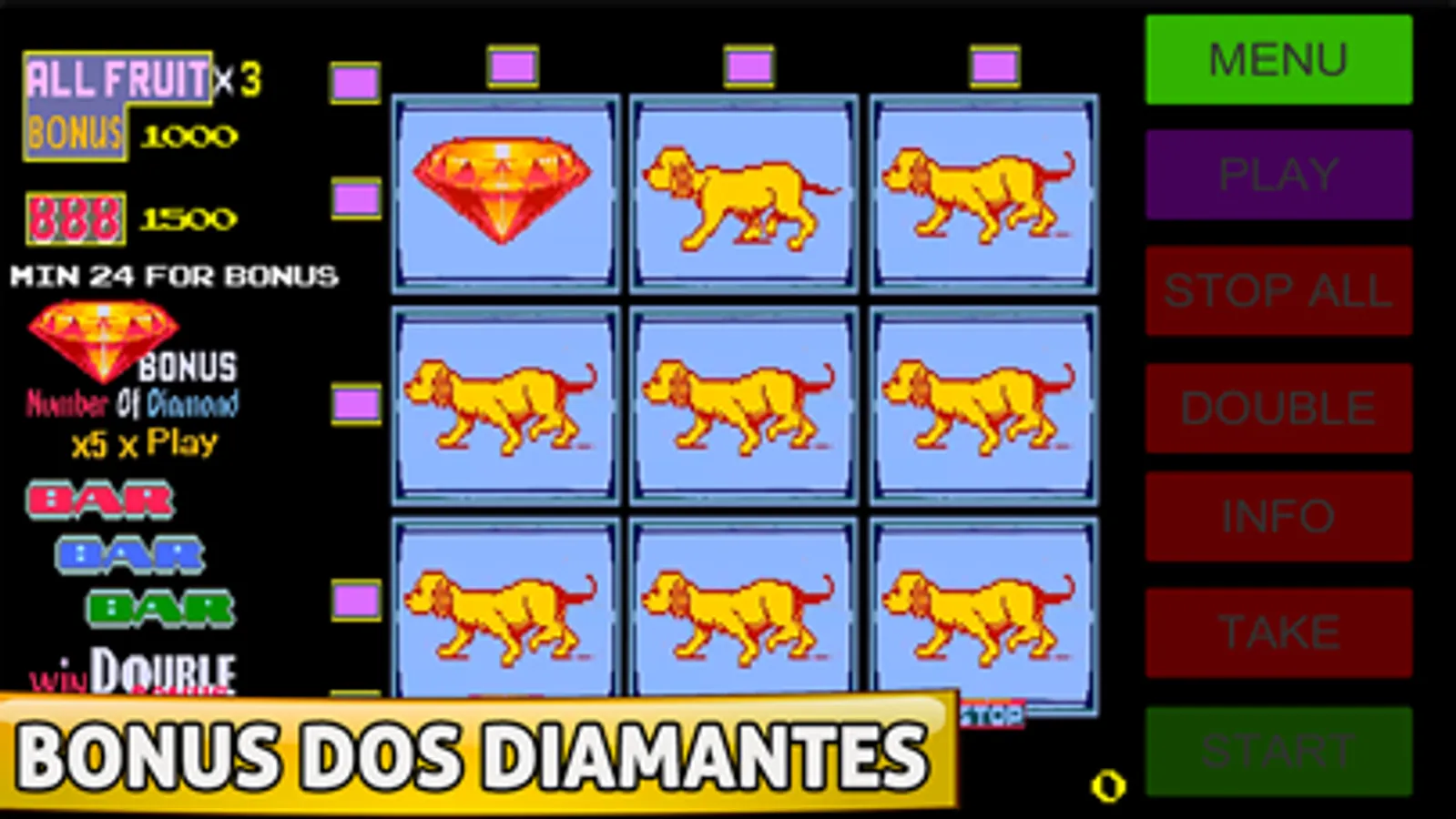Uma maquininha caça niquel classica estilo Cherry Master e New Fruit Bônus 96. Bônus dos diamantes onde o cachorro puxa um diamante premiado, respin ao tirar o 8, e a opção de dobra dos valores ganhos escolhendo cartas. Venha experimentar. Multiplique seus ganhos e se divirta gratuitamente nesse mundo de cassino.