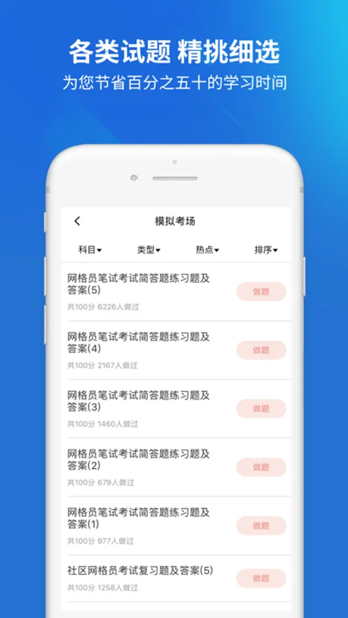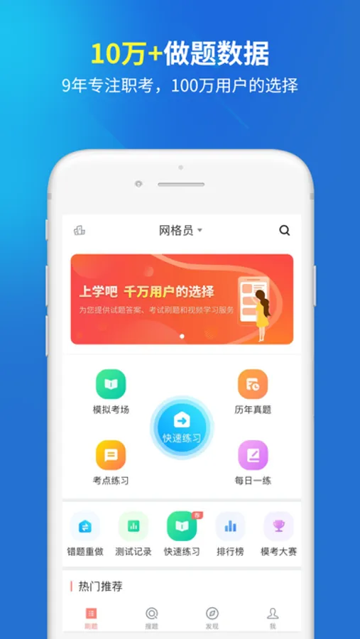 网格员题库有模拟考场、历年真题练习、每日一练、快速练习、考点练习、考试押题、做题记录等多种学习与做题模式、丰富多样化的陪你一起考网格员考试。