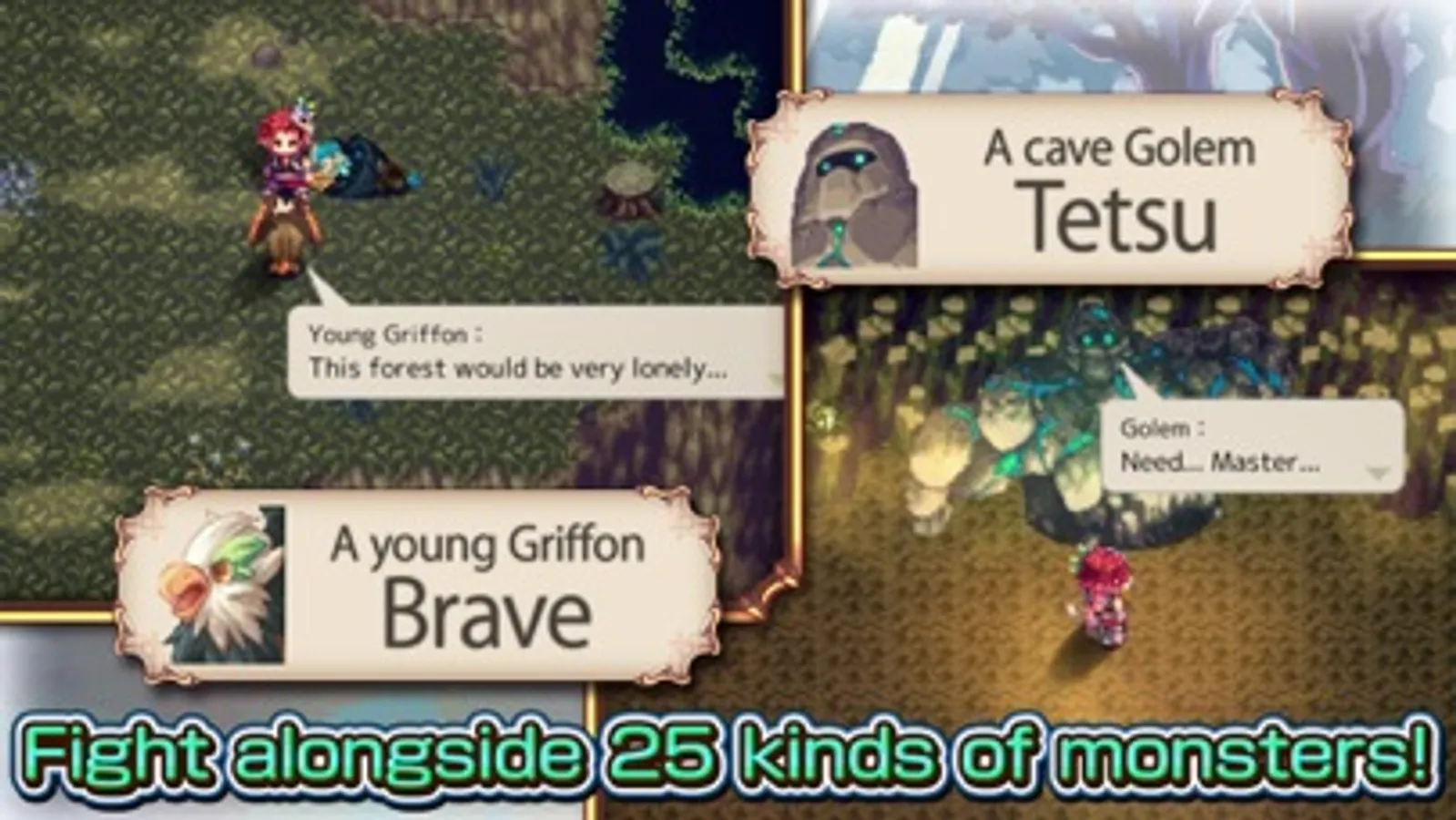 Ride a dragon and soar the skies or on a raft down the river! Compelling pixel art breathes life into your adventure. Journey with more than 20 monsters, each with their own abilities and personalities. Hang tight and take your time in exploring not only challenging dungeons but what this fantasy RPG has to offer!