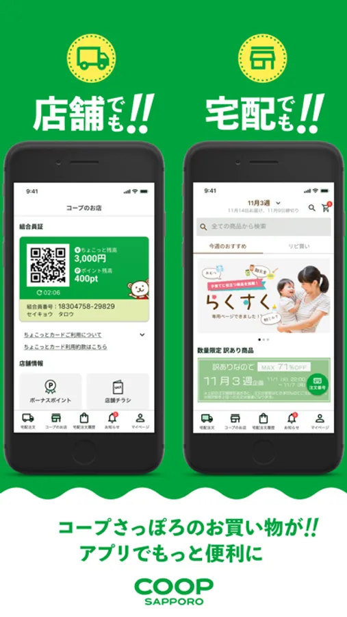 コープさっぽろのお店や宅配トドックで便利にご利用いただけます。