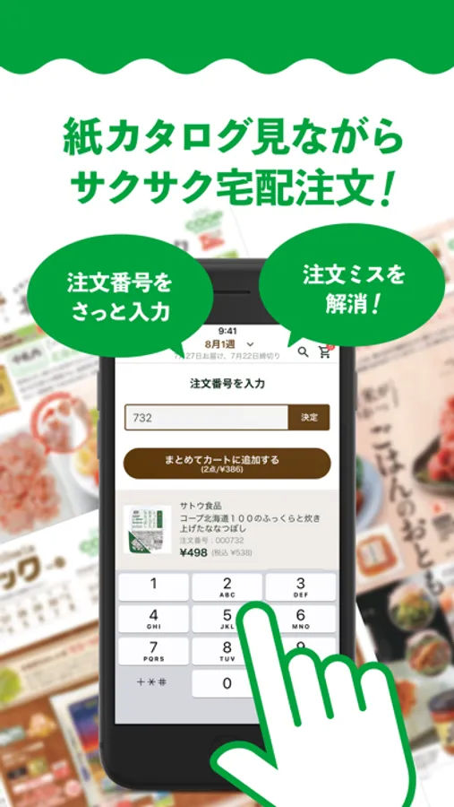 紙のカタログがそのままスマホに。番号をタップするだけで注文できます。