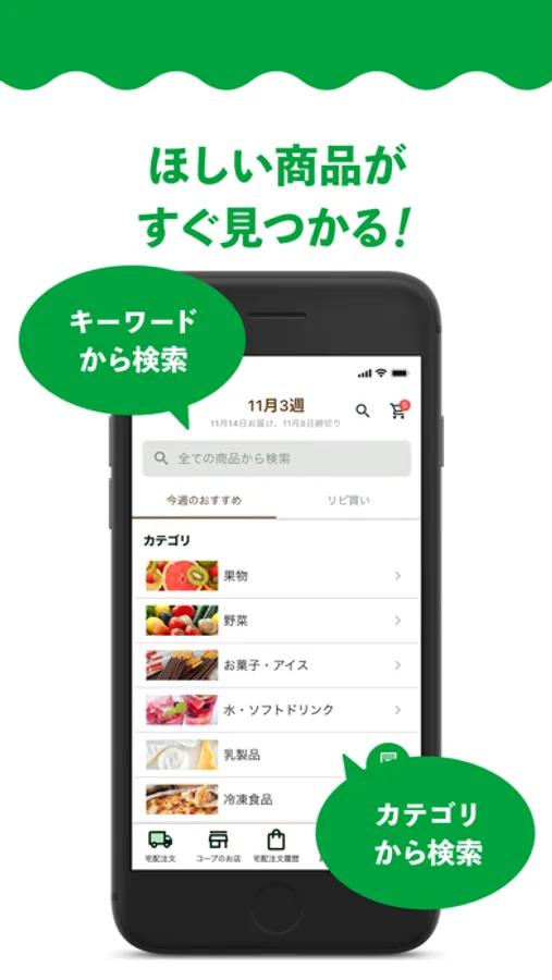 カテゴリ別に商品を探せるので、欲しい商品がすぐに見つかります。