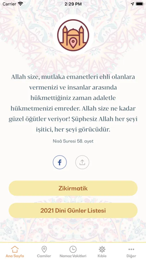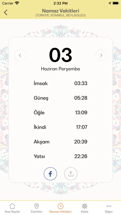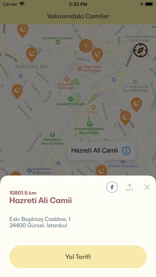 Cami adreslerini ve namaz vakitlerini dilerseniz arkadaşınız, eşiniz, aileniz ile mail, mesaj ve sosyal medya aracılığıyla paylaşabilirsiniz.