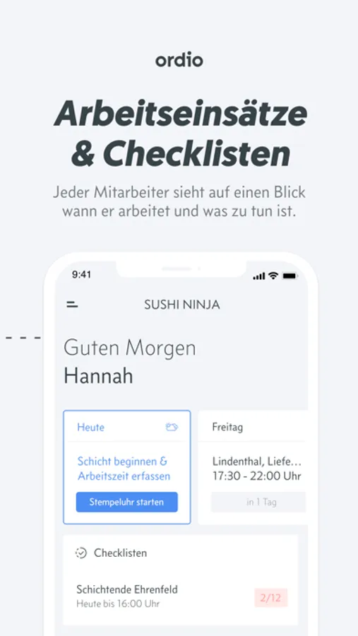 Deskless Workforce Management - Automatisiere tägliche Abläufe in deinem Restaurant mit der Ordio Workflow Automation. Neben einer umfangreichen Personalverwaltung und Personaleinsatzplanung kannst du in Verbindung mit Ordio Workspaces Dienstpläne erstellen, Arbeitszeiten erfassen, Checklisten erstellen und Dokumente deiner Mitarbeiter ablegen uvm.