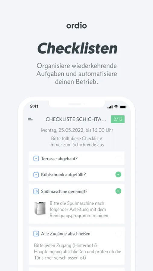 Mit Checklisten erstellst du wiederkehrende Aufgaben oder einmalig auszufüllende Listen für deine Mitarbeiter. Von Checkbox über Signatur, Foto, Text oder Wert kann eine Vielzahl von Antwortmöglichkeiten vorgegeben werden. Eine ausführliche Auswertung hilft bei der Optimierung des Betriebs.