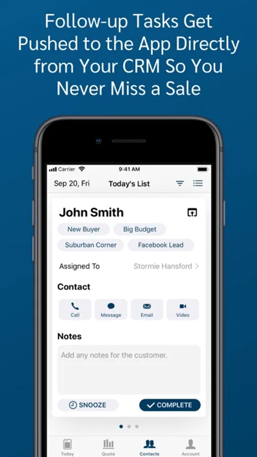 Schedule and complete follow-up tasks directly from the app, or auto-assign from the CRM