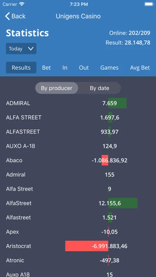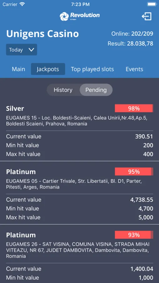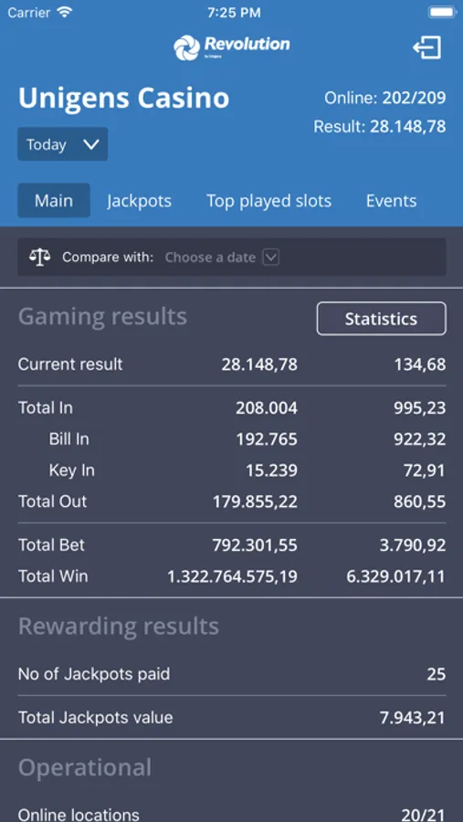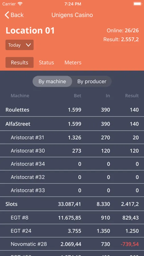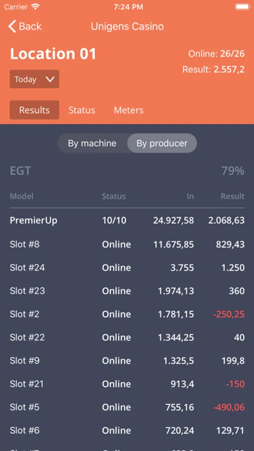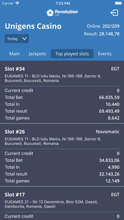 Real-time profits, drops and bets for all tracked machines, for each location and for each machine. In order to facilitate quick decision making, Revolution provides highlights of the most profitable playing locations, slot machines and roulettes.