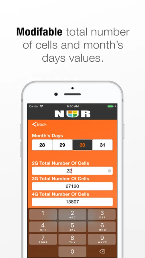 3)The App saves the total number of cells per band and the month’s days values once they are used in the NUR calculations if however these values are modified and not used, they are not saved.