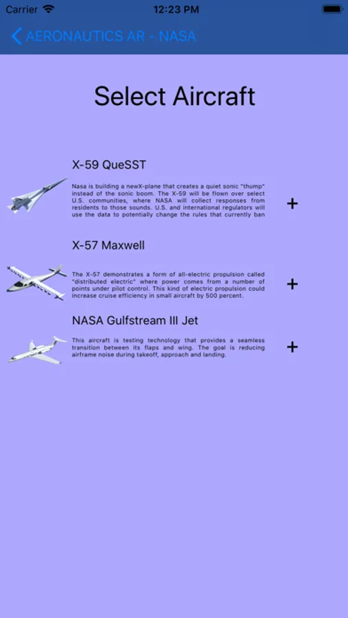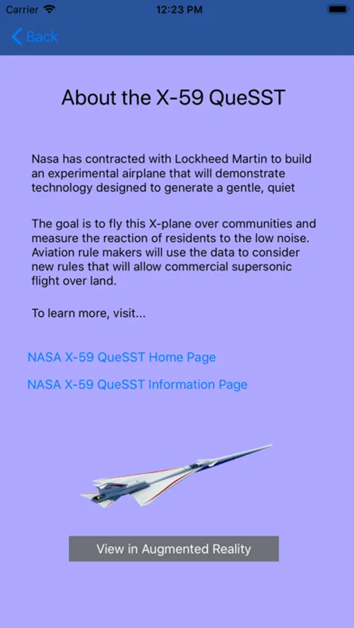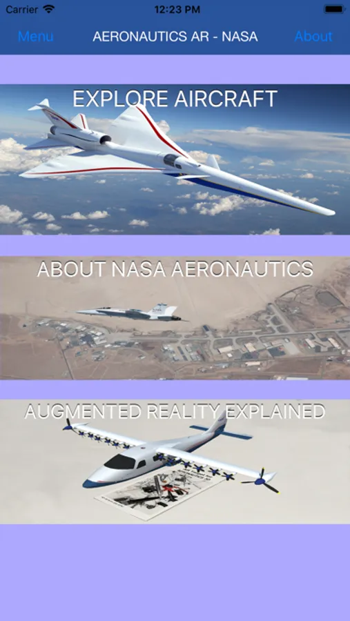 NASA Aeronautics AR is an augmented reality mobile app designed to educate people about NASA's X-planes and aviation research programs. The information presented here showcases some of the advancements and far-reaching impact that NASA has on the aviation industry. Using the mobile phone’s camera pointed at a flat surface, this app displays 3D models of current or future NASA research aircraft.