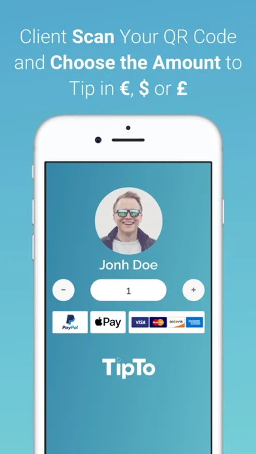 The QR Code automatically redirects your client to a web page where he can easily and intuitively choose the tip amount to send to you. Different currencies are available.