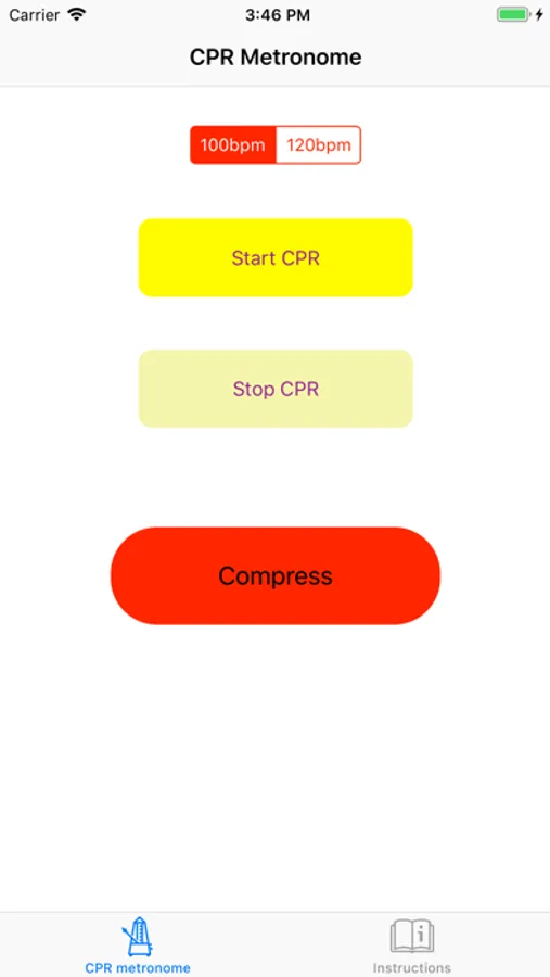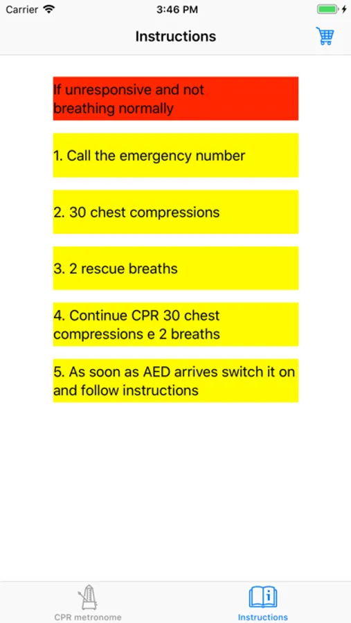 CPR Metronome allows you – in training sessions – to learn faster the correct rhythm to keep for the best quality of CPR. It gives you a visual and acustical signal to keep 100bpm or 120 bpm. In the second screen you can see the steps to do, if you see a person who is unresponsive and doesn’t breathe.