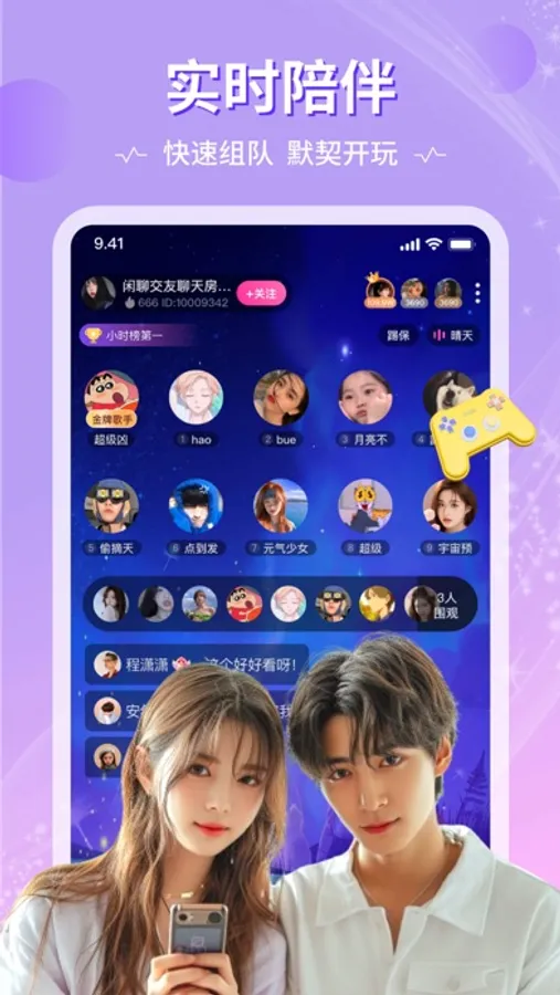 K歌,扩列,电竞,踢保,相亲海量娱乐派对,随时随地多人语音连麦畅聊,相亲房、情侣房、K歌房等的个性房间,等你来参与。