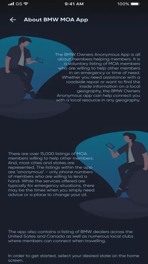 The BMW MOA Anonymous App is all about members helping members. It is a voluntary listing of MOA members who are willing to help other members in an emergency or time of need. Whether you need assistance with a roadside repair or want to find the inside information on a local geography, the BMW Owners Anonymous app can help connect you with a local resource in any geography.
