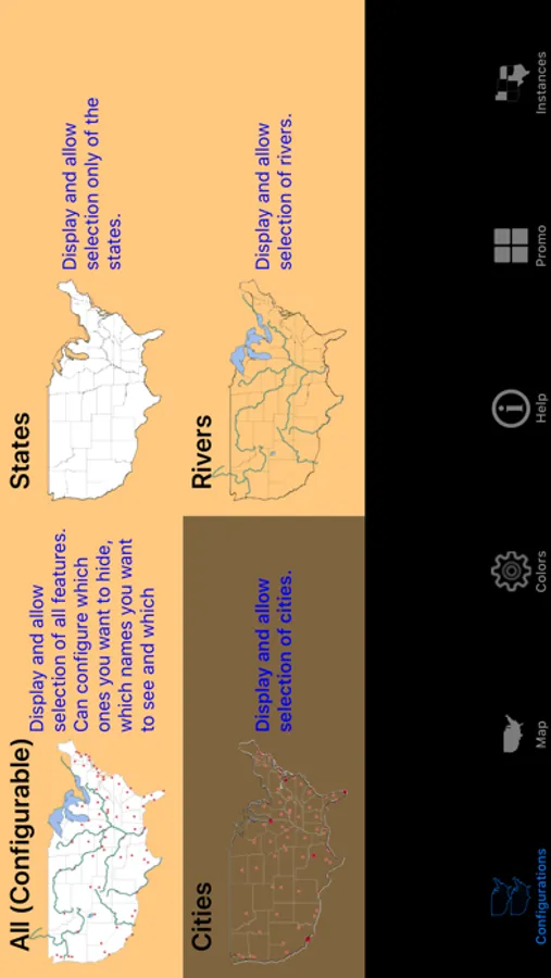Ever wanted to build your own map with only the features and instances of each feature that you wanted? Select from a pre built configuration or select the customizable option to build your own. Export any of the maps to your Camera Roll.