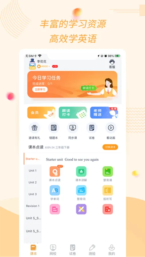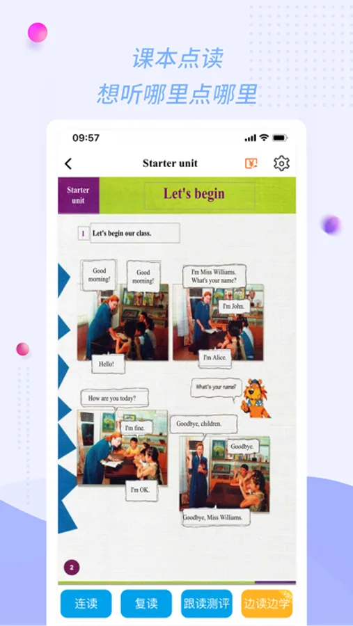 1)课本学习:同步校内外课本,沉浸式体验课本,支持课本点读、连读、复读、跟读测评,还有课本翻译、课后小练习看答案、课本听力文稿等;