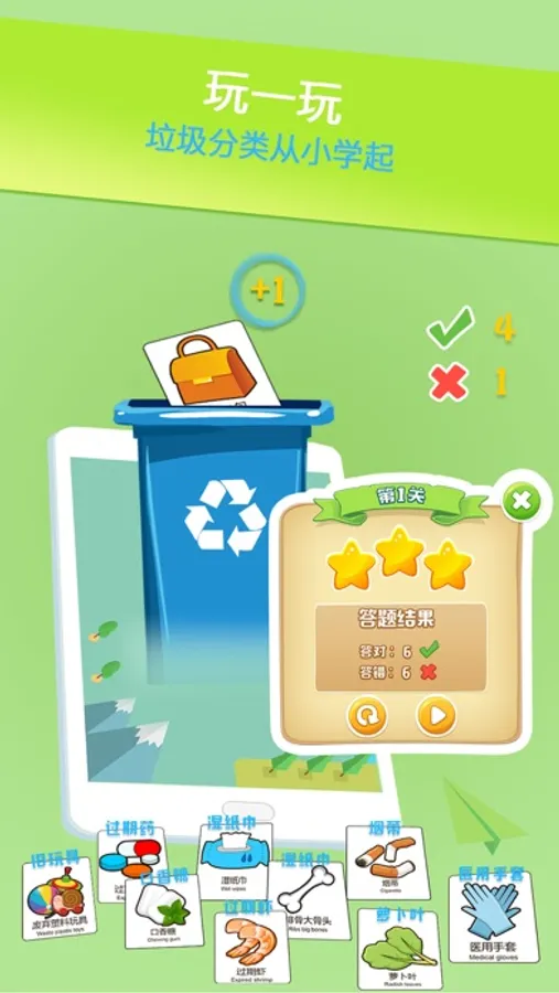 * 闯一闯:通过分类的小游戏闯关的方式让小孩轻松的完成垃圾分类,