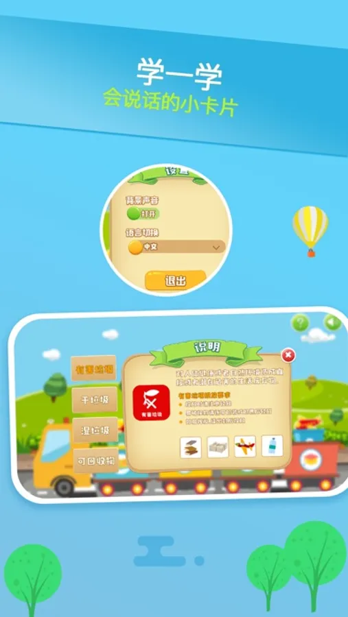 式让小孩学习生活中各种常见的垃圾知识以及类型,同时也有中英文