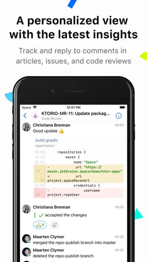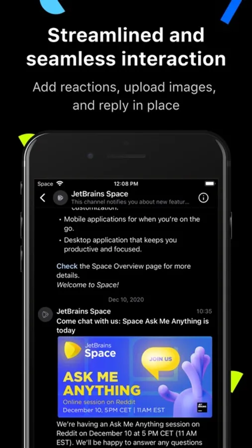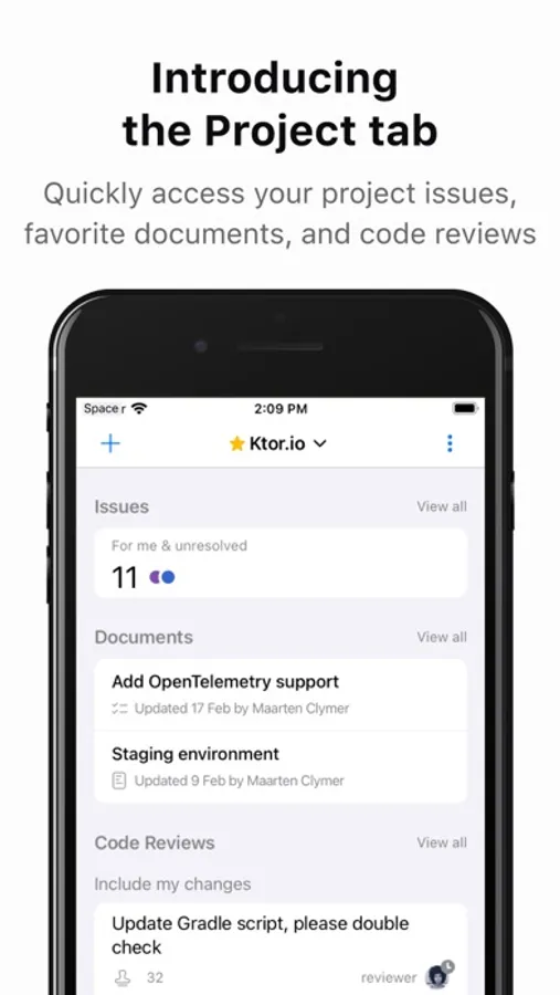 The Space mobile app is a companion app to Space, a complete software development platform for your team. Manage your entire software development process, from hosting Git repositories, performing advanced code reviews, automating your CI/CD pipeline, and publishing packages, to managing issues, documents, and chats – all in one place and integrated with JetBrains IDEs.