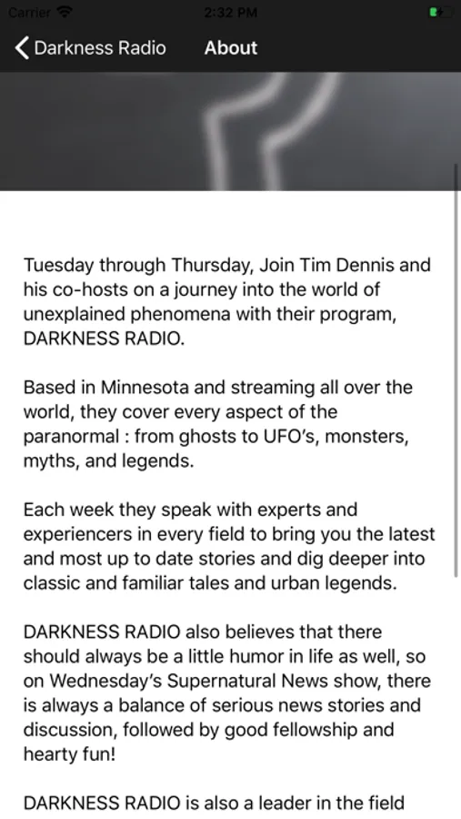 WARNING! This app may lead you to being abducted by aliens, haunted in the worst possible manner or, in extreme cases, possessed by unknown forces. Darkness Radio & ScareWare Creations accept no responsibility. You have been warned!