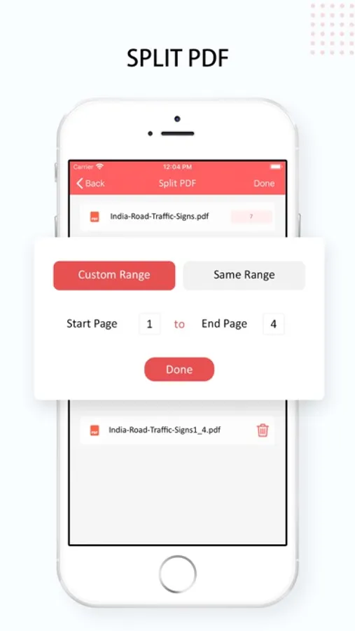 Split any PDF file in the phone memory into multiple PDF files with desired range.