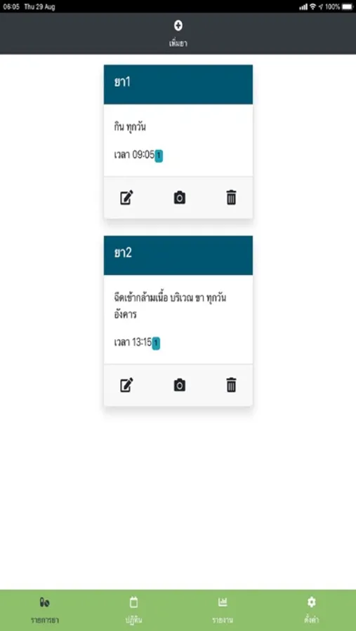 • กดเพิ่มยา ที่แถบสีดำด้านบนของจอ เพื่อเพิ่มรายการยาที่ต้องการให้เตือน แล้วกรอกรายละเอียดตามที่กำหนดให้ครบ ระบบจึงแจ้งเตือนเมื่อถึงเวลาใช้ยา