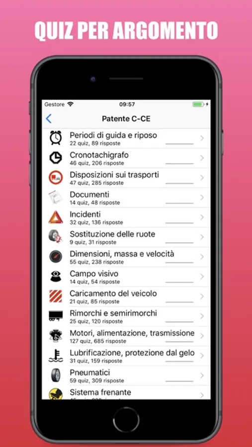 - Possibilità di visualizzare per ogni argomento i quiz mai risposti ed i quiz errati organizzati per numero di errori;