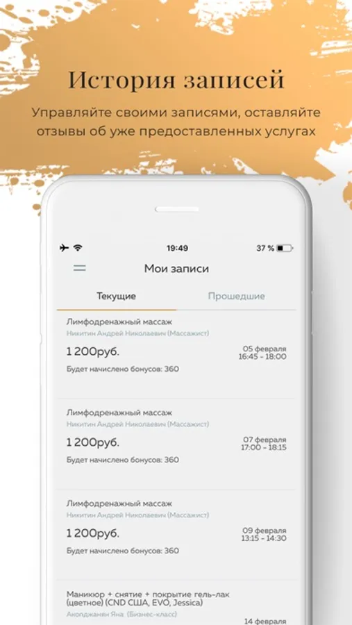 Мои записи - информация о предстоящих записях, а так же о прошедших (с возможностью оставить отзыв о качестве обслуживания).