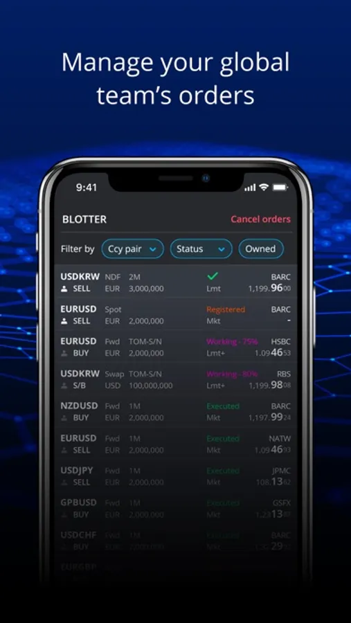 Use the fully customisable product watchlist to monitor executable streaming prices direct from your associated liquidity providers. Tap on a watchlist entry to bring up an order entry ticket. Switch to the blotter to track the progress of your team's orders. Quickly filter by currency pair, ownership and trade status. Swipe left to archive orders. React instantly to unwelcome, out of hours news events by amending or cancelling working orders.