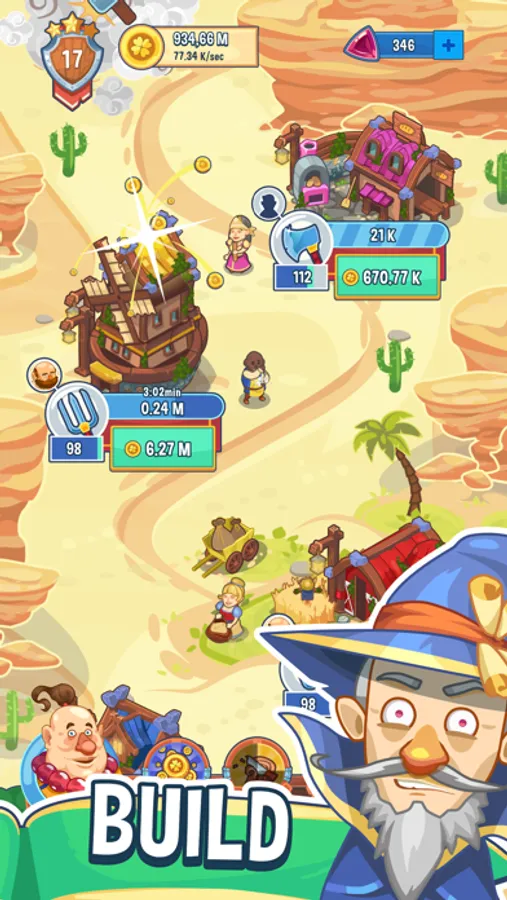 * Tap! Tap! Mechanics™: Earn gold and manage your settlement to optimize idle production