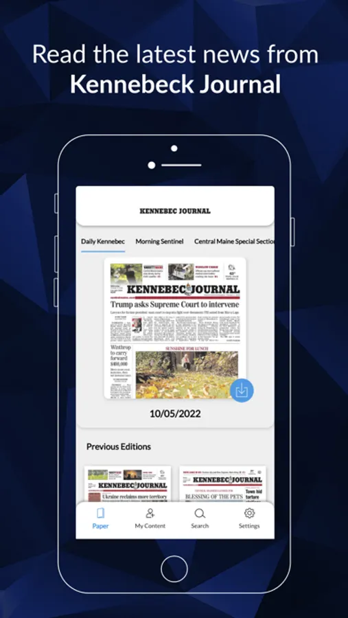 The Kennebec Journal/Central Maine Sunday is the daily newspaper serving the Augusta area. The Kennebec Journal/Central Maine Sunday e-Paper is an exact replica of the print edition, available on your mobile device each morning.The e-Paper is designed to highlight the best aspects of the print experience, with the convenience of a digital one. Flip pages, zoom-in on an article or photo, save, print and share articles, or catch up on news you may have missed in our archives. Happy reading.